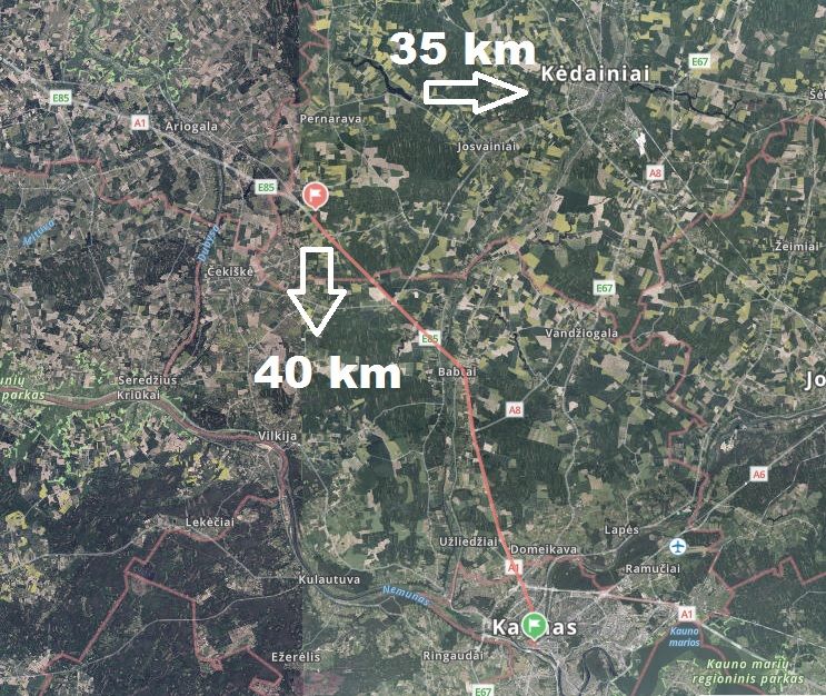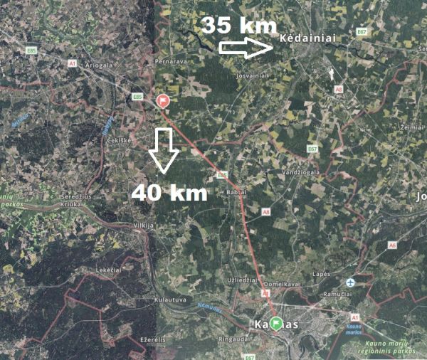 Iki Kėdainių 35 km, Kauno miesto centro apie 40 km, tik 30 min automobiliu geru mastraliniu keliu.